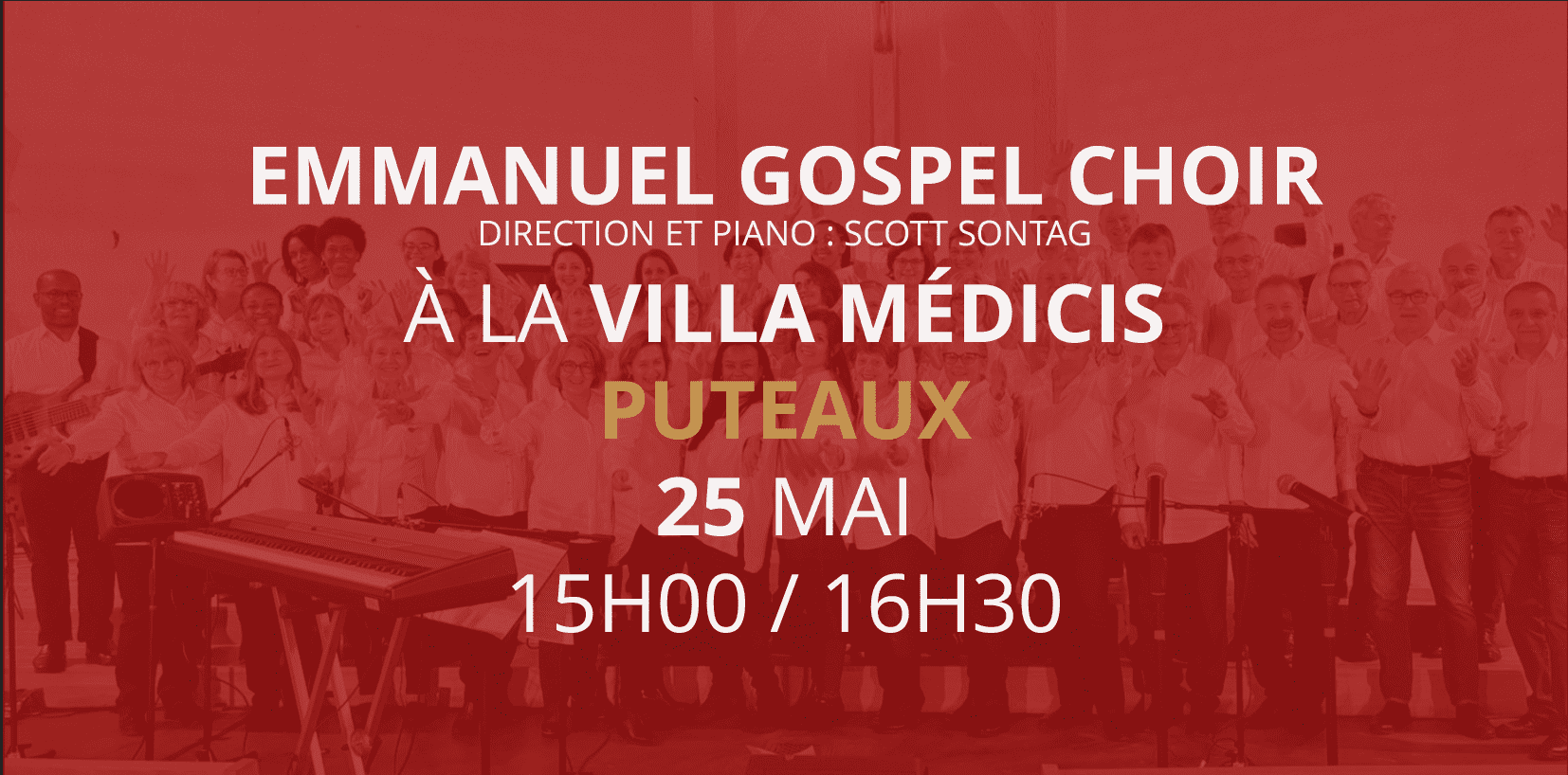Ne manquez pas un magnifique concert de gospel à la Villa Médicis de Puteaux pour une soirée festive ! EMMANUEL GOSPEL CHOIR illumineront la scène avec des classiques du gospel, vous transportant dans une atmosphère conviviale !